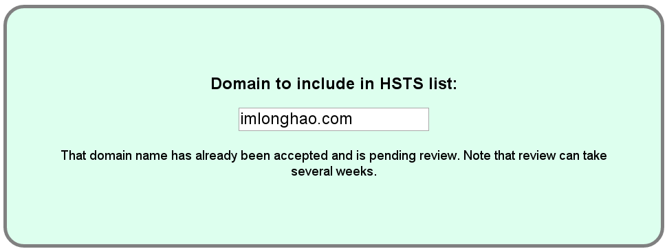 www存在的话也同样需要通过 HTTPS 传输。例如我的子域名是subdomain.imlonghao.com,并且www.subdomain.imlonghao.com也存在,所以www.subdomain.imlonghao.com也需要通过 HTTPS 传输 - 在相应的域名中输出 HSTS 响应头
