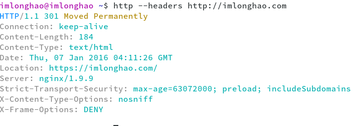 假设一个用户从来没有访问过我的网站,并且他第一次访问的时候访问的是 http://imlonghao.com ,在正常的情况下,我的服务器就会给这位用户返回一个 301 跳转到 https://imlonghao.com ,并且带上 HSTS 头