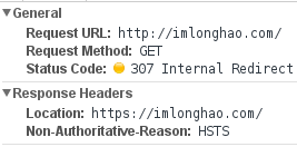 在用户下次访问我的博客时,只要 HSTS 还在有效期中,浏览器就会直接响应一个 HTTP 307 头,并跳转到相对应的 https 页面,并且这是不需要经过数据传输的,直接在本地浏览器进行的处理