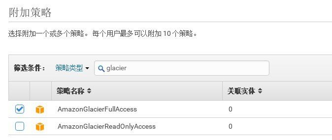 由于我们要写入数据,因此我们选择 AmazonGlacierFullAccess 然后确定