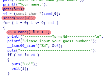 通过 main 函数可以看到有两个问题,一个是使用了 gets 存在栈溢出,另一个是使用了 srand 初始化随机数种子