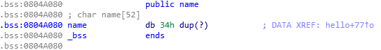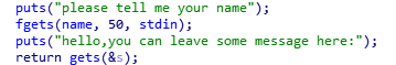 然后,我们去哪里写 /bin/sh 呢?回到 hello 函数,发现在 gets 的上面通过 fgets 函数读取了我们的名字,并且保存在了 bss 段中