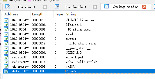 继续检查,可以发现程序使用了 system 函数,但是没有直接给我们 /bin/sh