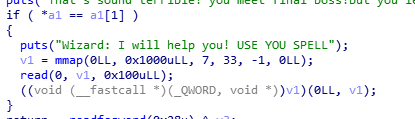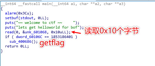 看了看程序的主要逻辑,首先读取 0x10 个字节放到 unk_601068 的位置上,接着判断 dword_60106C是否等于 1853186401 ,如果等于,则我们可以拿到 flag