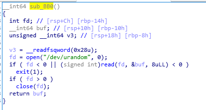 srand 进行初始化的时候,是通过 sub_BB0 函数初始化的,而该函数使用了 /dev/urandom 来取得随机数的。