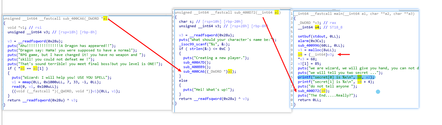 可以知道 v4 的长度为 8,并且在内存中的地址比 v5 的高,堆从高地址向低地址生长,因此可以通过 v4 覆盖到 v5。