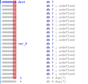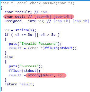 看到 check_passwd 的时候就发现问题了,其中使用了 strcpy 函数,将 s 复制到 dest,而 dest 的大小只有 11
