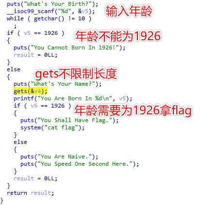 可以在程序中看到 gets(&v4),这就是本题的漏洞点了,gets 没有指定接受多少位,因此这里可以实现溢出。