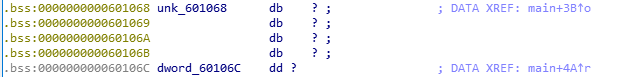 接着看 unk_601068 和 dword_60106C 的位置和大小,unk_601068 只有 4 位,我们可以通过溢出覆盖下面的 dword_60106C,这样我们就能使程序逻辑运行到 getflag 的函数了。