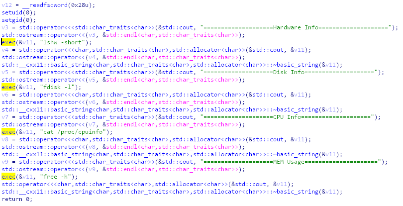 看到这个 /bin/sysinfo 就很可疑,一般系统都没这个文件,而且 +s 了,我们可以以 root 用户运行该文件,下面就来分析一下这个文件
