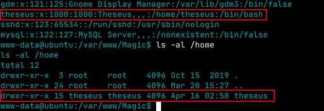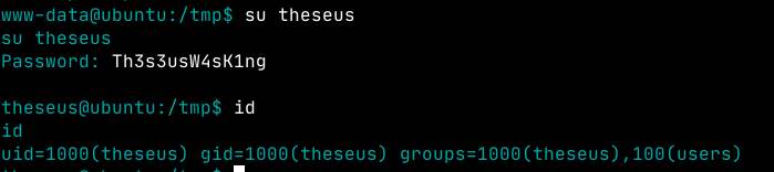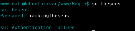 尝试从 www-data 通过 su 使用密码切换过去,密码错误!我们还需要找到 theseus 真正的密码。
