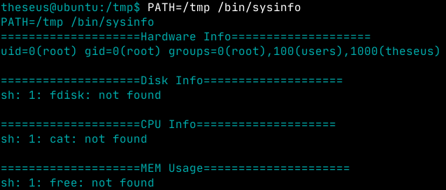 而我们可以通过自定义 $PATH 的方式,让 /bin/sysinfo 去执行我们可以控制的文件