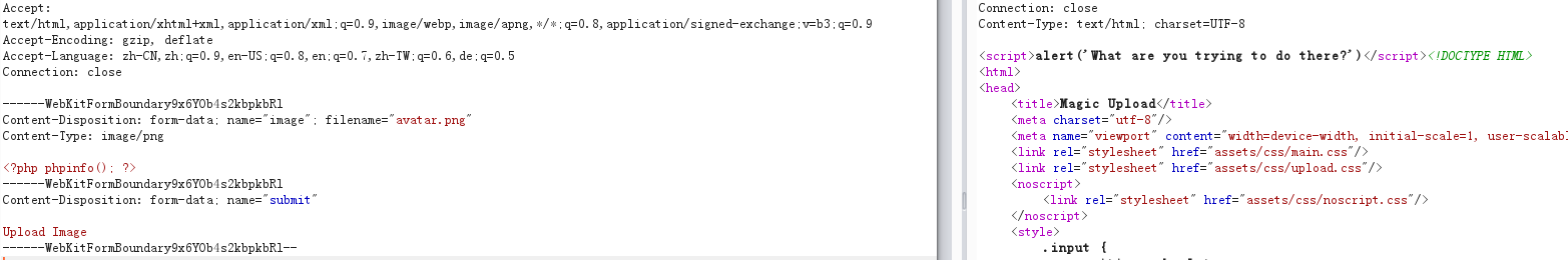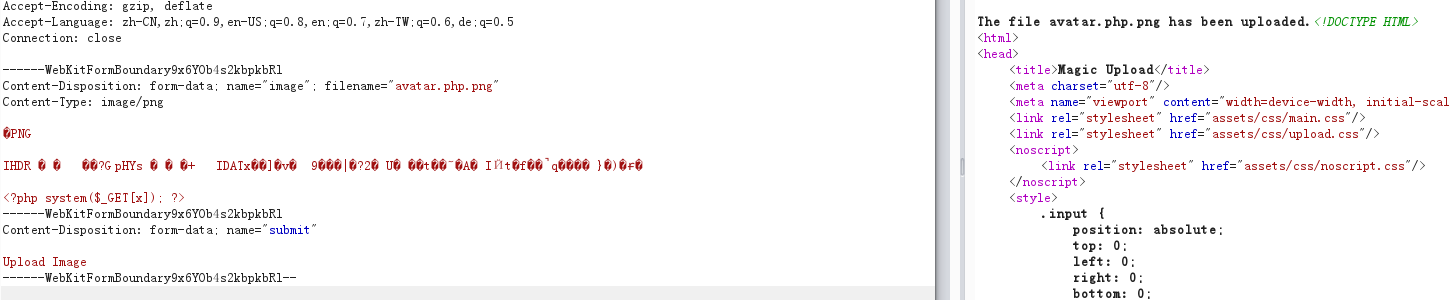 那么尝试上传文件名 111.php.png,图片头保留,但是后面的内容修改成 PHP 代码