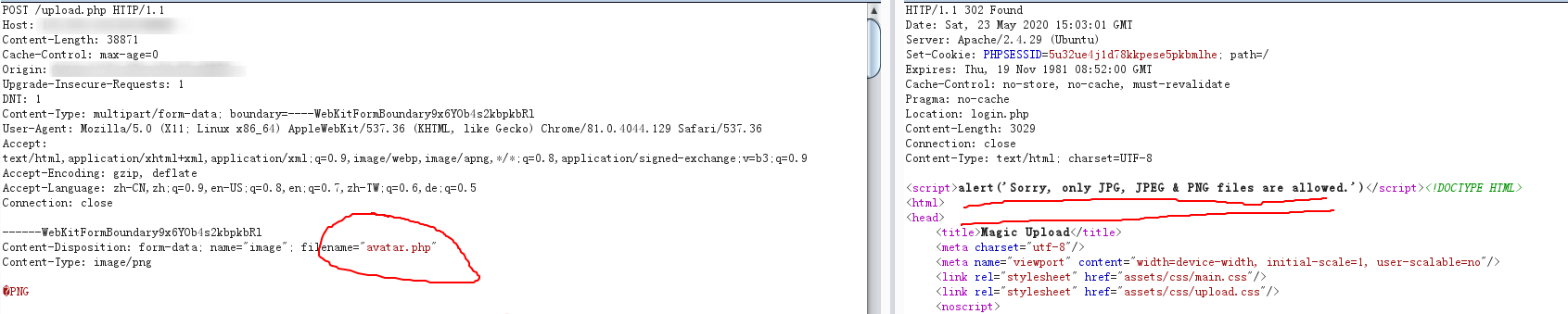 当修改文件名为 avatar.php 时会拒绝上传,提示只有 JPG / JPEG / PNG 文件可以上传,初步确定系统判断了文件后缀。