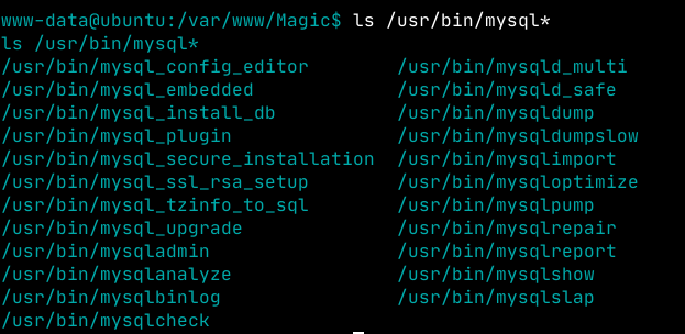 往上面几个目录翻一翻,可以看到数据库的链接文件 /var/www/Magic/db.php5 ,从中我们可以知道 MySQL 的用户名和密码