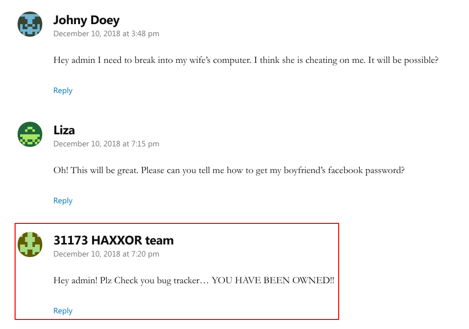 看到有一个署名为「31173 HAXXOR team」的人发了一条评论,说管理员你被黑了,让去看一下「bug tracker」