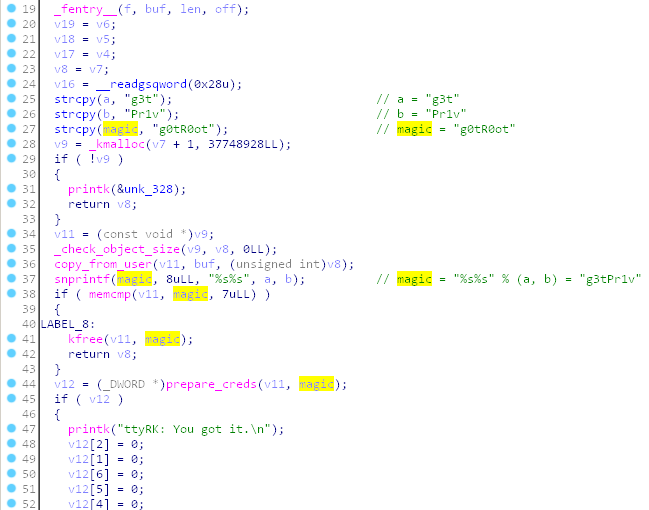 最终的 magic 的值应该是 g3tPr1v,内核后门的利用方法就变成了:
