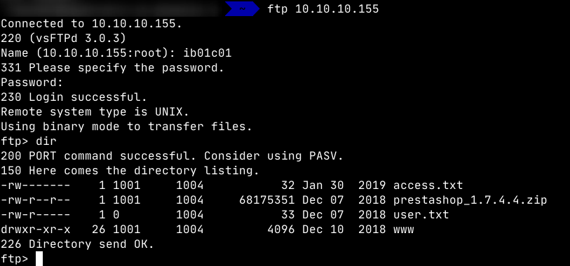 上面我们知道网站提供 FTP 功能,并且也知道了 ib01c01 对应网站的管理员密码是 GetYouAH4t!,那么有没有可能这个密码也是 ftp 的密码呢?