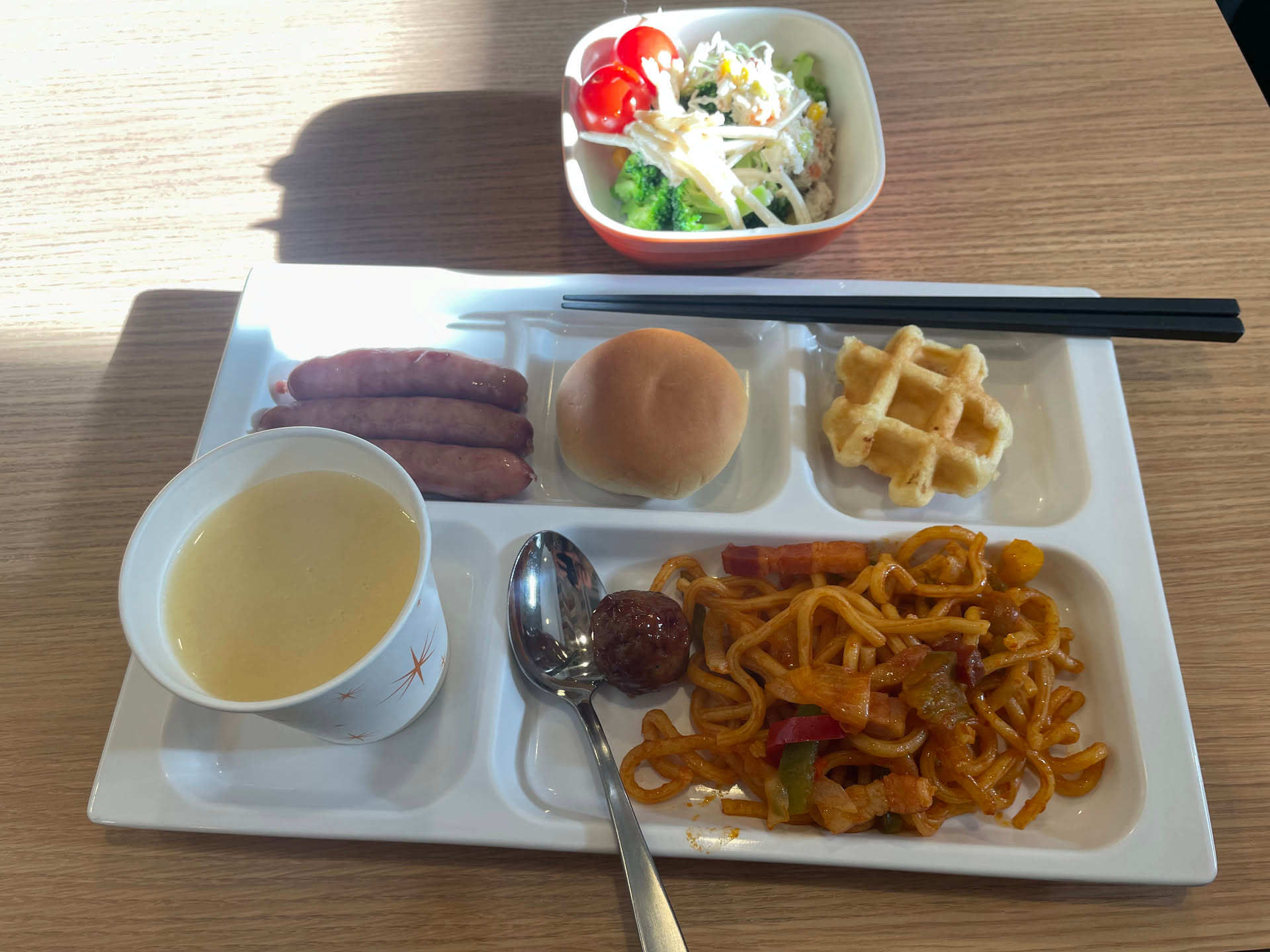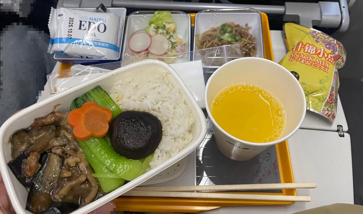 机上餐食的量还是比较多的,有饼干 + 黄油、沙拉、炒面和饭,剩下的那个什锦小点吃不了一点就已经饱了。