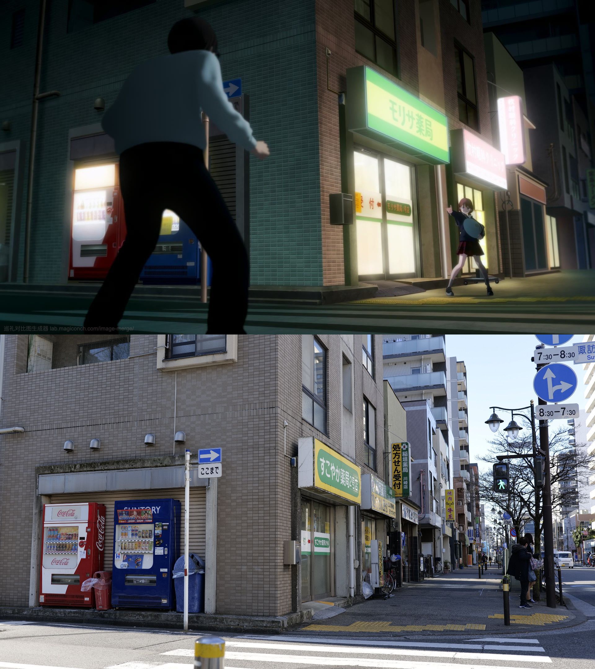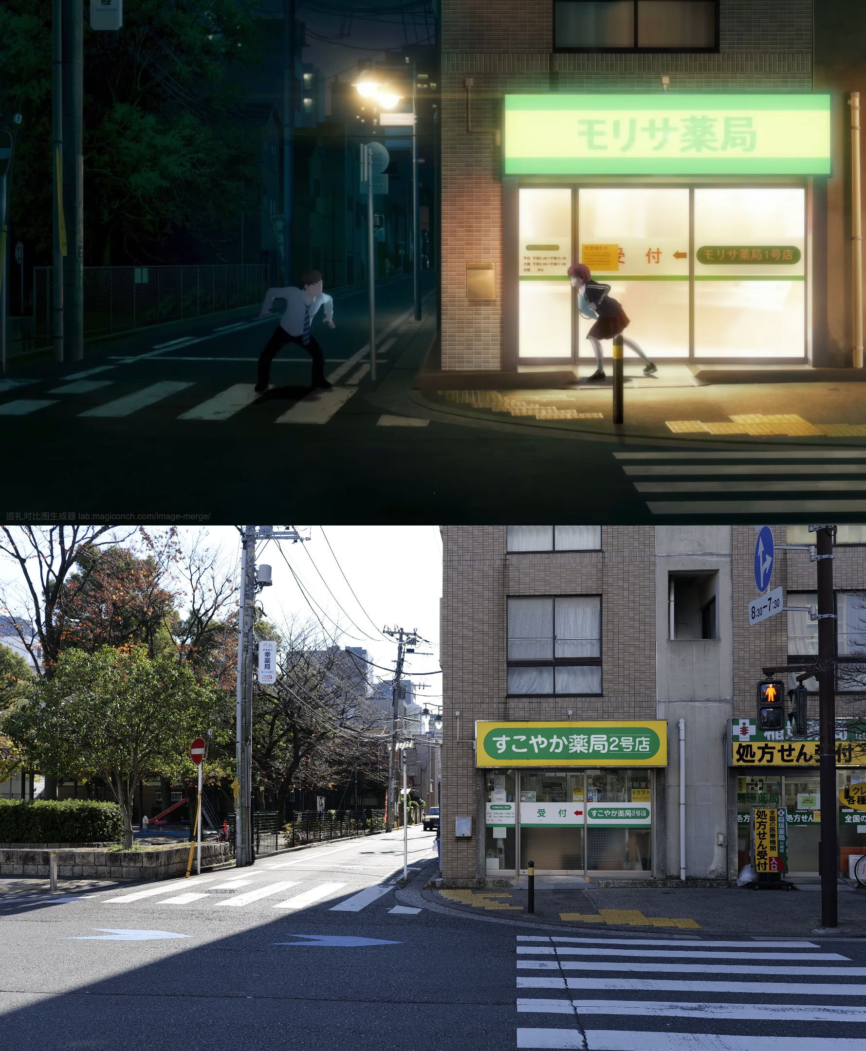 (諏訪公園前,注意看左边的禁行路牌是弯的,符合原作)